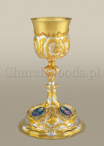 Kielich mszalny wykonany z mosiądzu, złocony, fragmentami srebrzony. Stopa kielicha zdobiona plakietkami z wizerunkami Rodziny Świętej wykonanymi techniką emalii komórkowej. Posiada warstwę ochronną zabezpieczającą przed ciemnieniem srebra, odciskami palców, wilgotnością powietrza i innymi szkodliwymi czynnikami.
