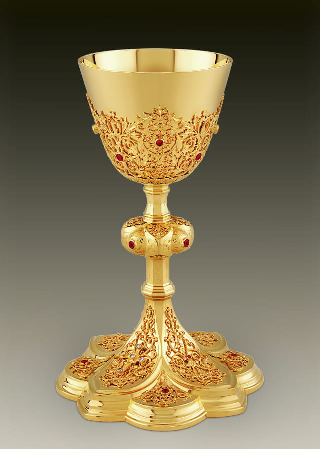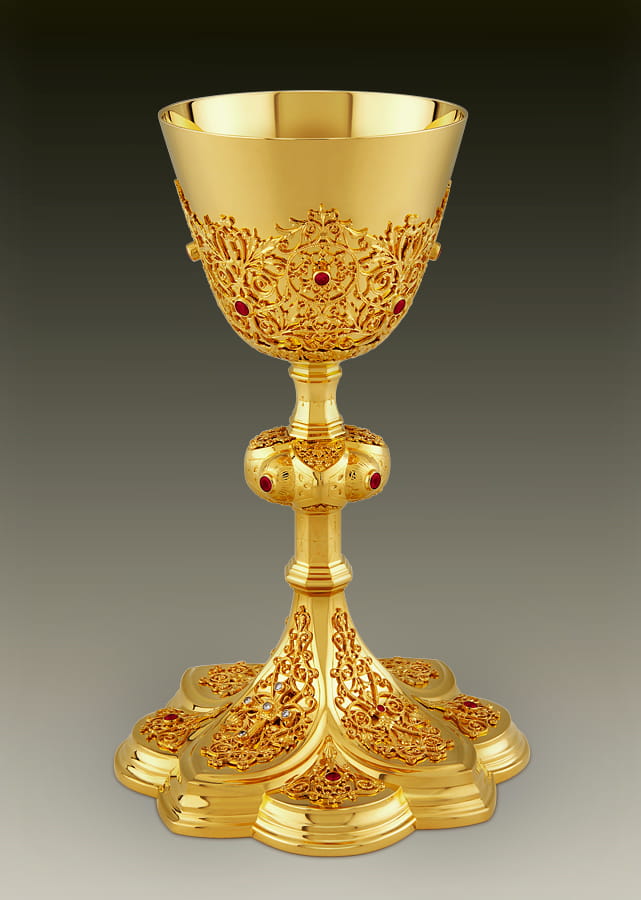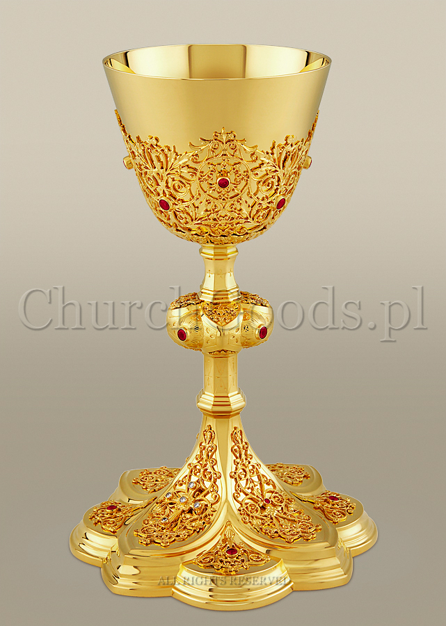 Kielich mszalny wykonany z mosiądzu, złocony, zdobiony filigranami i rubinami. Model inspirowany oryginalnymi francuskimi kielichami neogotyckimi z przełomu XIX i XX wieku.