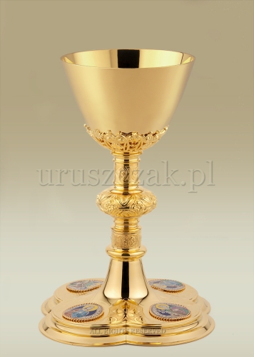 Kielich mszalny wykonany z mosiądzu, złocony. Zdobiony medalionami z wizerunkami Rodziny św. i św. Jana Ewangelisty, wykonanymi techniką emalii komórkowej.