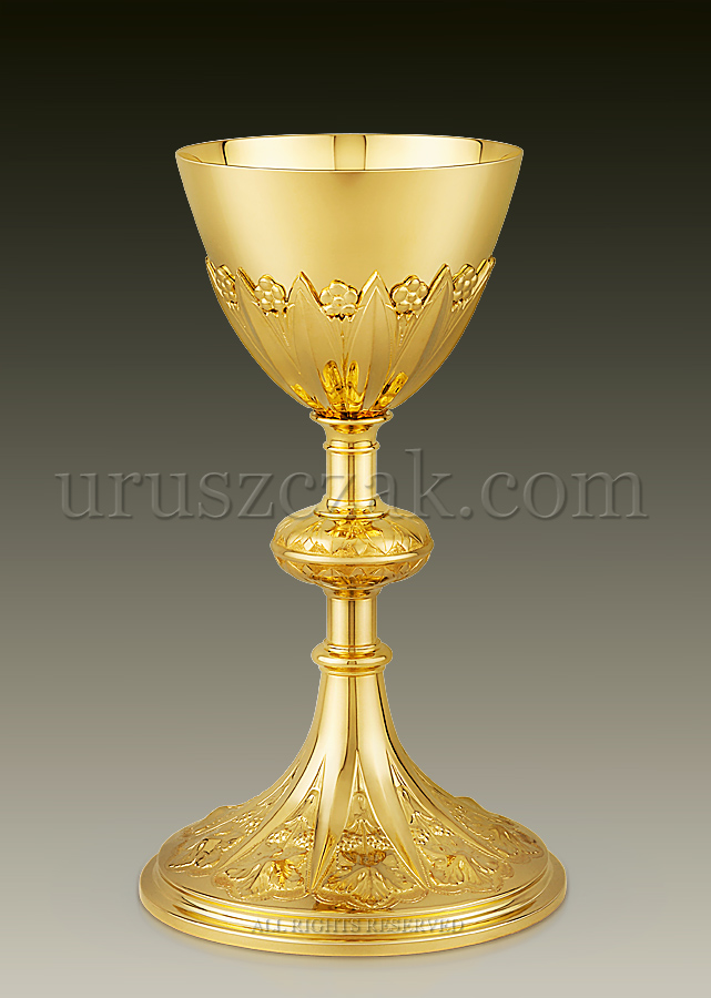 Kielich mszalny w stylu eklektycznym wykonany z mosiądzu, złocony. Czara, nodus oraz podstawa zdobione motywem roślinnym.