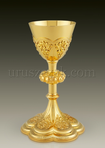 Kielich mszalny wykonany z mosiądzu, złocony. Model wzorowany na eklektycznych kielichach z przełomu XIX i XX wieku.