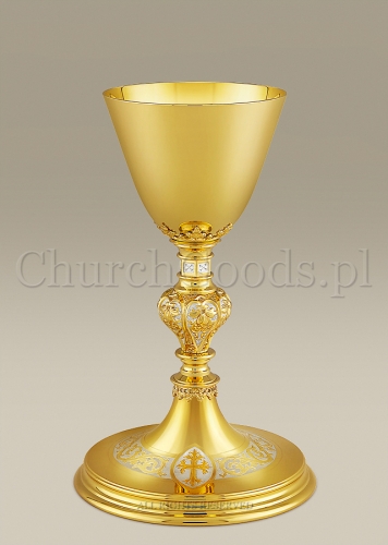 Kielich mszalny wykonany z mosiądzu, złocony, fragmentami srebrzony. Posiada warstwę ochronną zabezpieczającą przed ciemnieniem srebra, odciskami palców, wilgotnością powietrza i innymi szkodliwymi czynnikami.