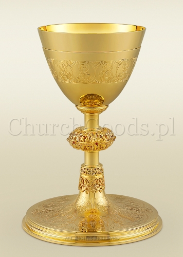 Kielich mszalny o klasycznym kształcie wykonany z mosiądzu, pozłacany. Ozdobiony filigranowymi motywami roślinnymi i grawerowanymi scenami ze Starego I Nowego Testamentu oraz wizerunkami Apostołów.