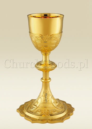 Eklektyczny kielich mszalny wykonany z mosiądzu, złocony. Ozdobiony symbolami eucharystycznymi. Model wzorowany na kielichach z przełomu XIX i XX wieku.