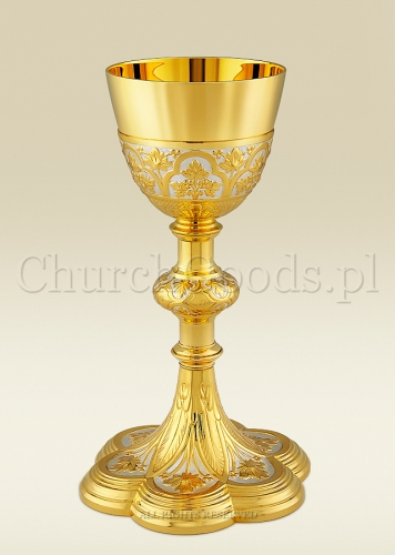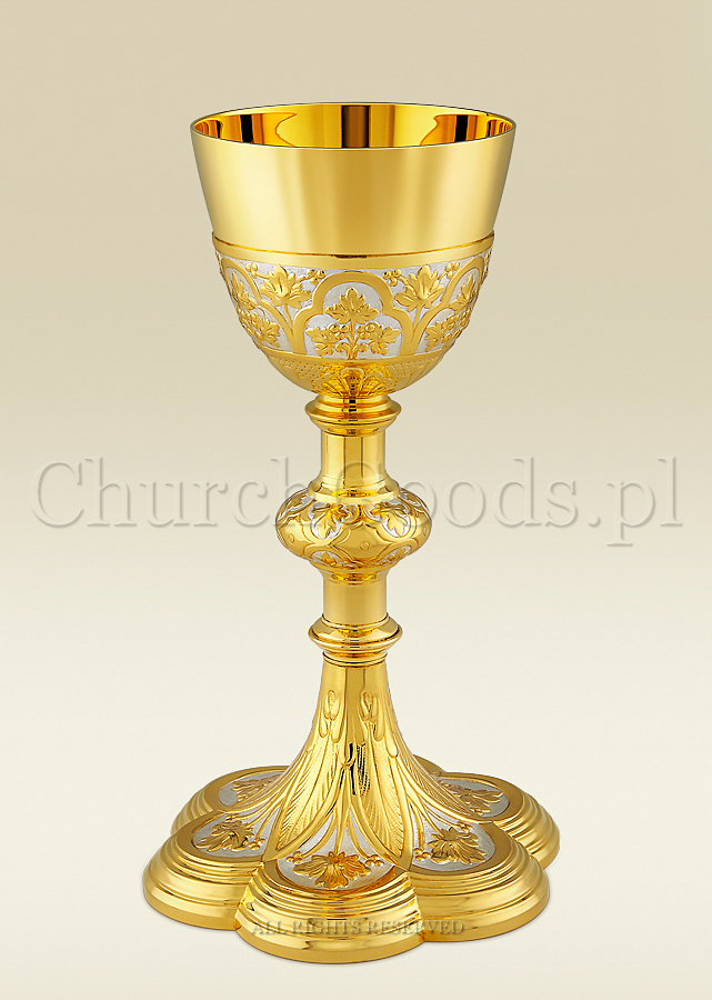 Kielich mszalny w stylu eklektycznym wykonany z mosiądzu, złocony, fragmentami srebrzony. Posiada warstwę ochronną zabezpieczającą przed odciskami palców, wilgotnością powietrza i innymi szkodliwymi czynnikami.