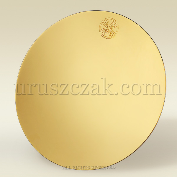 Patena do kielicha płaska (tzw. typ francuski), z wygrawerowanym krzyżykiem.