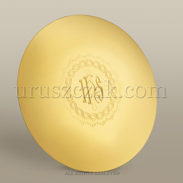 Patena do kielicha płaska (tzw. typ francuski) wykonana z mosiądzu, złocona. Spodnią stronę pateny zdobi grawerowany znak IHS w cierniowej koronie, wierzchnią stronę - delikatny grawerowany krzyżyk.