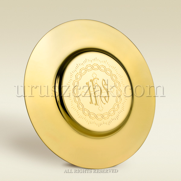 Patena do kielicha z wgłębieniem wykonana z mosiądzu, złocona. Spodnią stronę zdobi grawerowany znak IHS w cierniowej koronie, wierzchnią stronę - delikatny grawerowany krzyżyk.