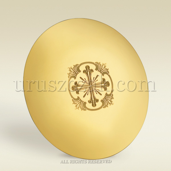 Patena do kielicha płaska wykonana z mosiądzu, złocona. Spodnią stronę zdobi grawerowany znak krzyża.