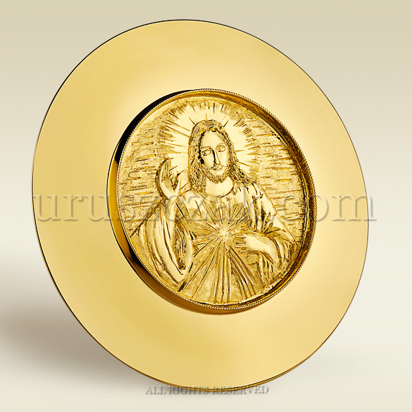 Patena do kielicha płaska (tzw. typ francuski), wykonana z mosiądzu, złocona. Cokół pateny o średnicy 10.7 cm zdobi płaskorzeźba Chrystusa Miłosiernego.