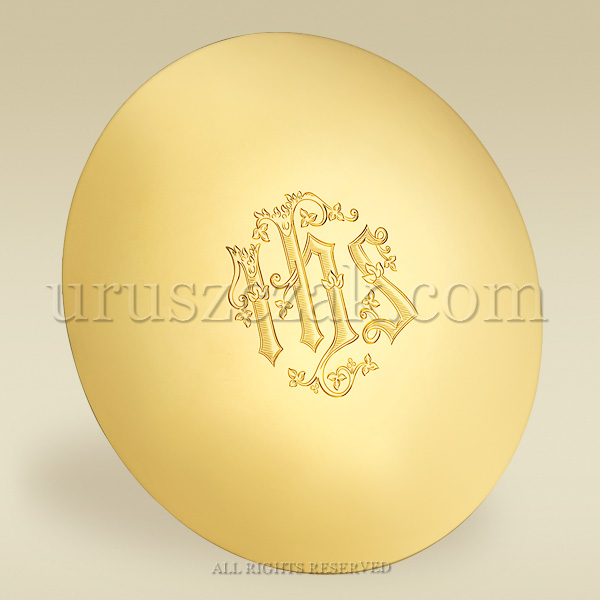 Patena do kielicha płaska (tzw. typ francuski), wykonana z mosiądzu, złocona. Spodnią stronę pateny zdobi grawerowany gotycki symbol IHS.