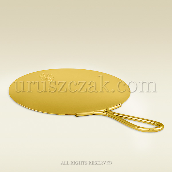 Patena do komunikowania z metalowym uchwytem wykonana z mosiądzu. Wierzchnią stronę pateny zdobi grawerowany znak krzyża.