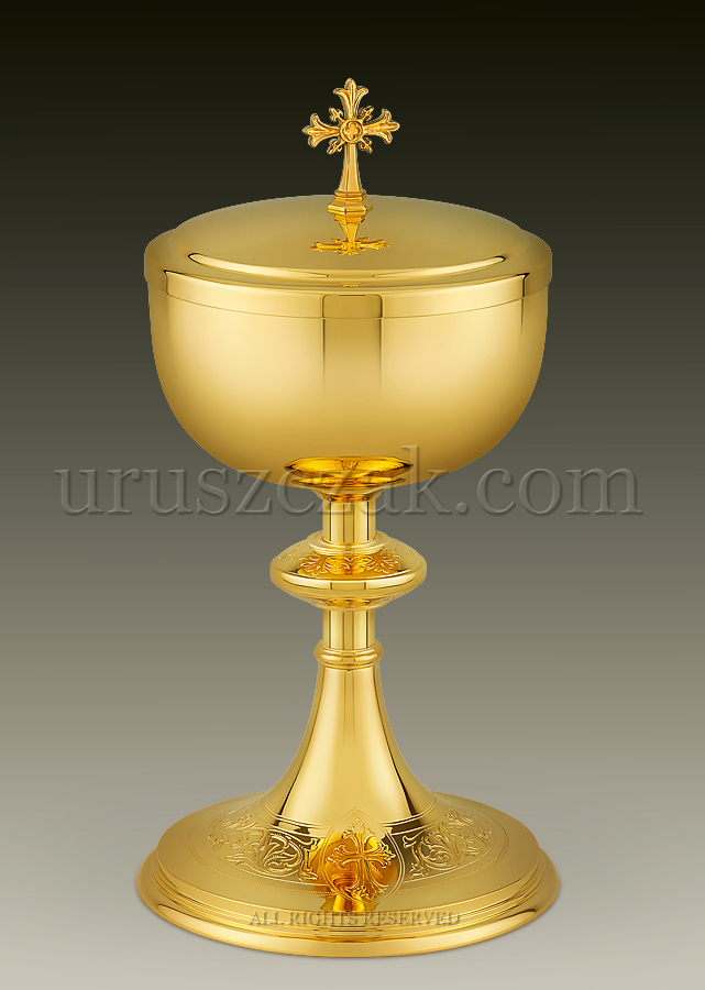 Puszka na komunikanty wykonana z mosiądzu, pokryta 24-karatowym zlotem. Utrzymana w tradycyjnej stylistyce z nodusem i podstawą zdobionymi delikatnymi wzorami roślinnymi wykonanymi technika grawerską.