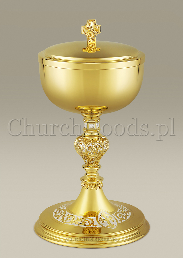 Puszka na komunikanty wykonana z mosiądzu, pokryta 24-karatowym złotem, miejscami srebrzona. Nodus i stopa puszki zdobione grawerowanym wzorem roślinnym. Posiada warstwę ochronną zabezpieczającą przed ciemnieniem srebra, odciskami palców, wilgotnością powietrza i innymi szkodliwymi czynnikami.