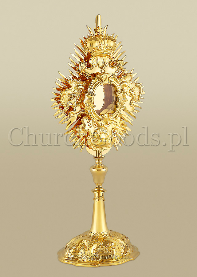 Relikwiarz w stylu barokowym, wykonany z mosiądzu, pokryty 24-karatowym złotem. Pojemnik z relikwiami zdobiony jest barokowymi wzorami, zwieńczonymi złotą koroną. Nodus gładki, podstawa trybowana.